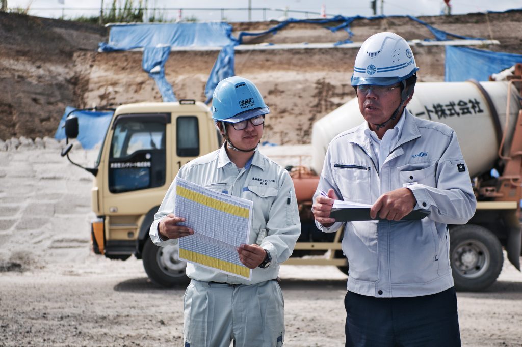 現場をチェックしつつ、コンクリートの品質を確かめたり、打たれたコンクリートを計測したりしていた。