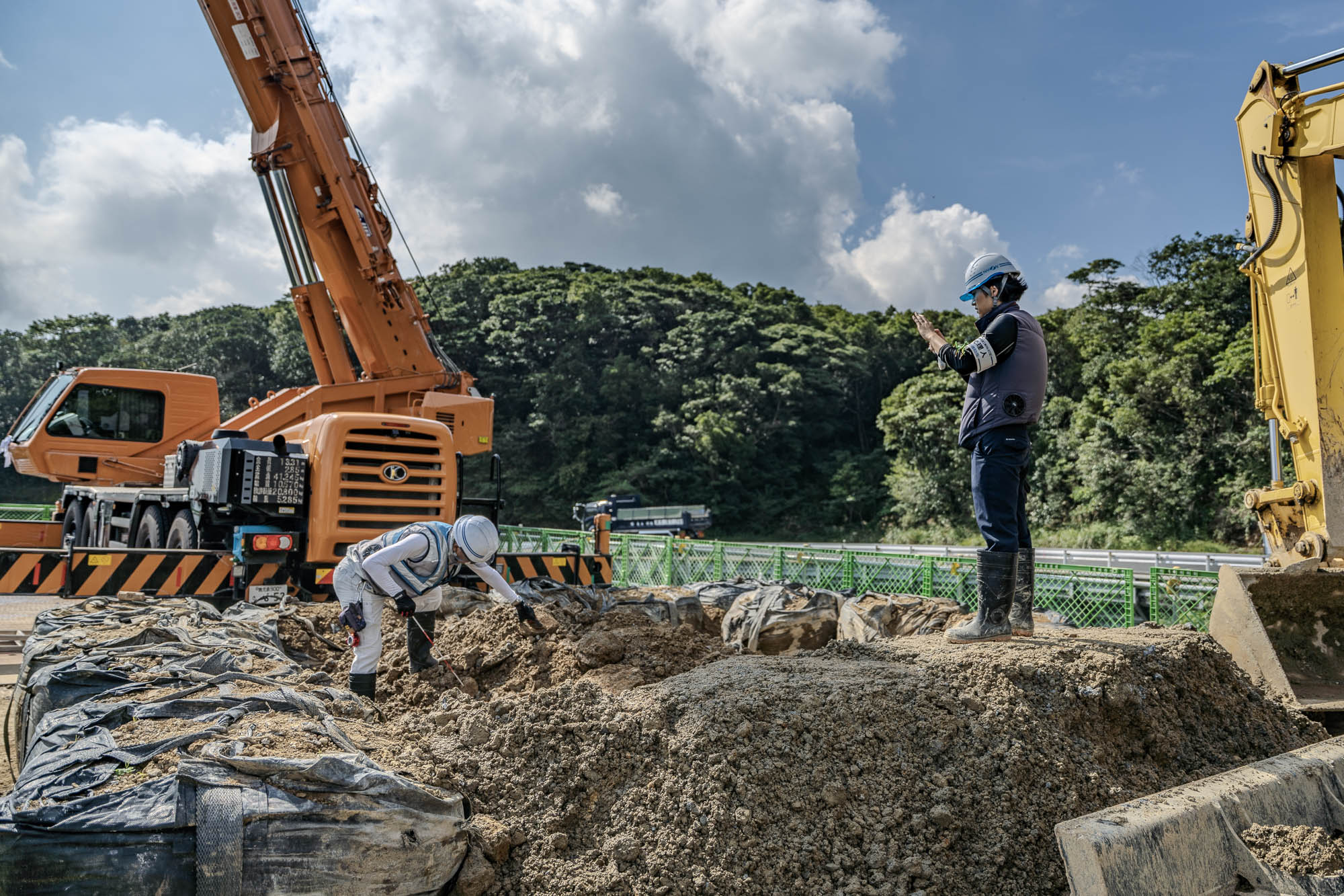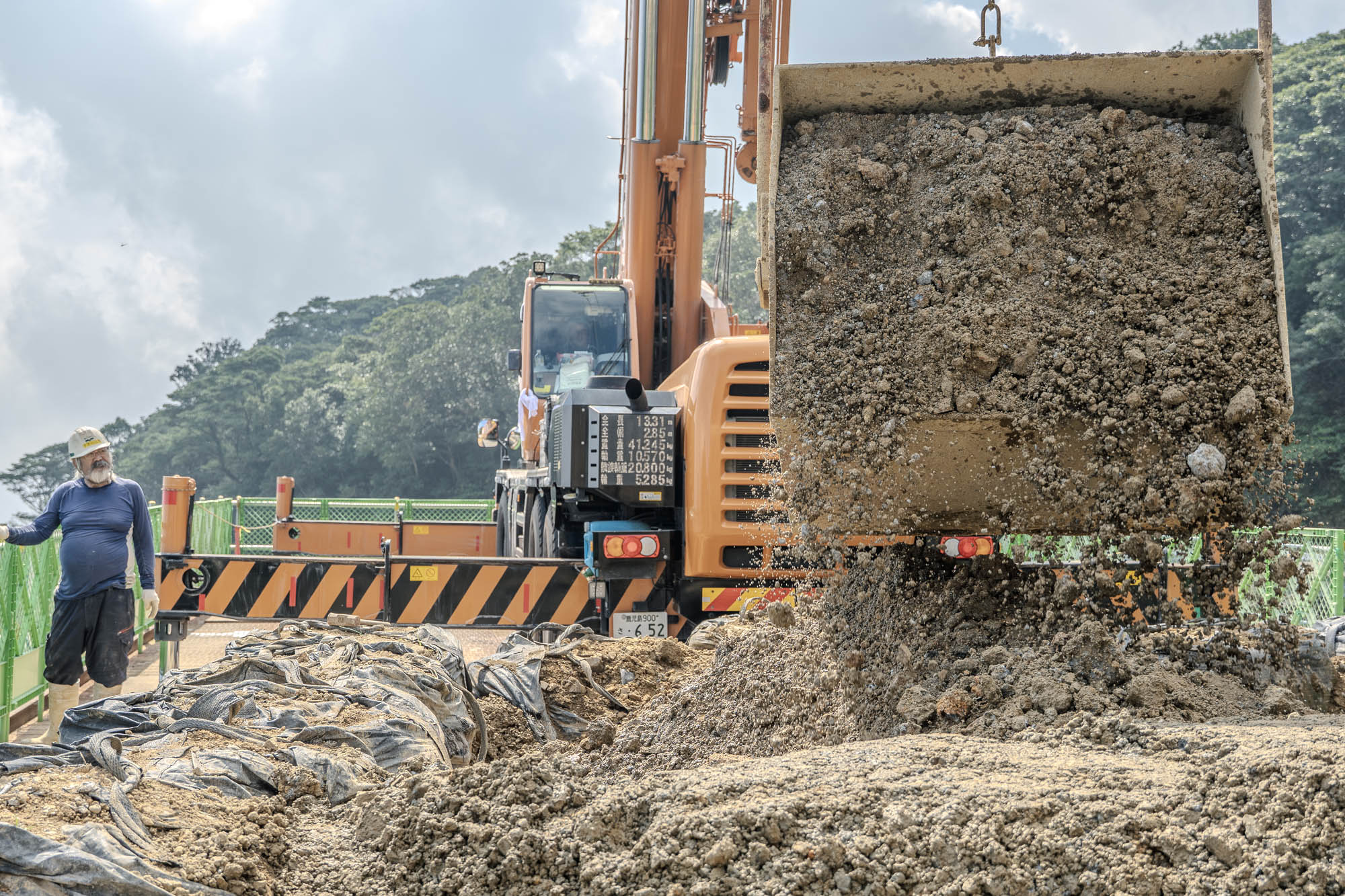 この現場は作業スペースが仮設の橋と谷の木を伐採した箇所だけなので、作業車や土砂や資材の置き位置を工夫しているそうです。
