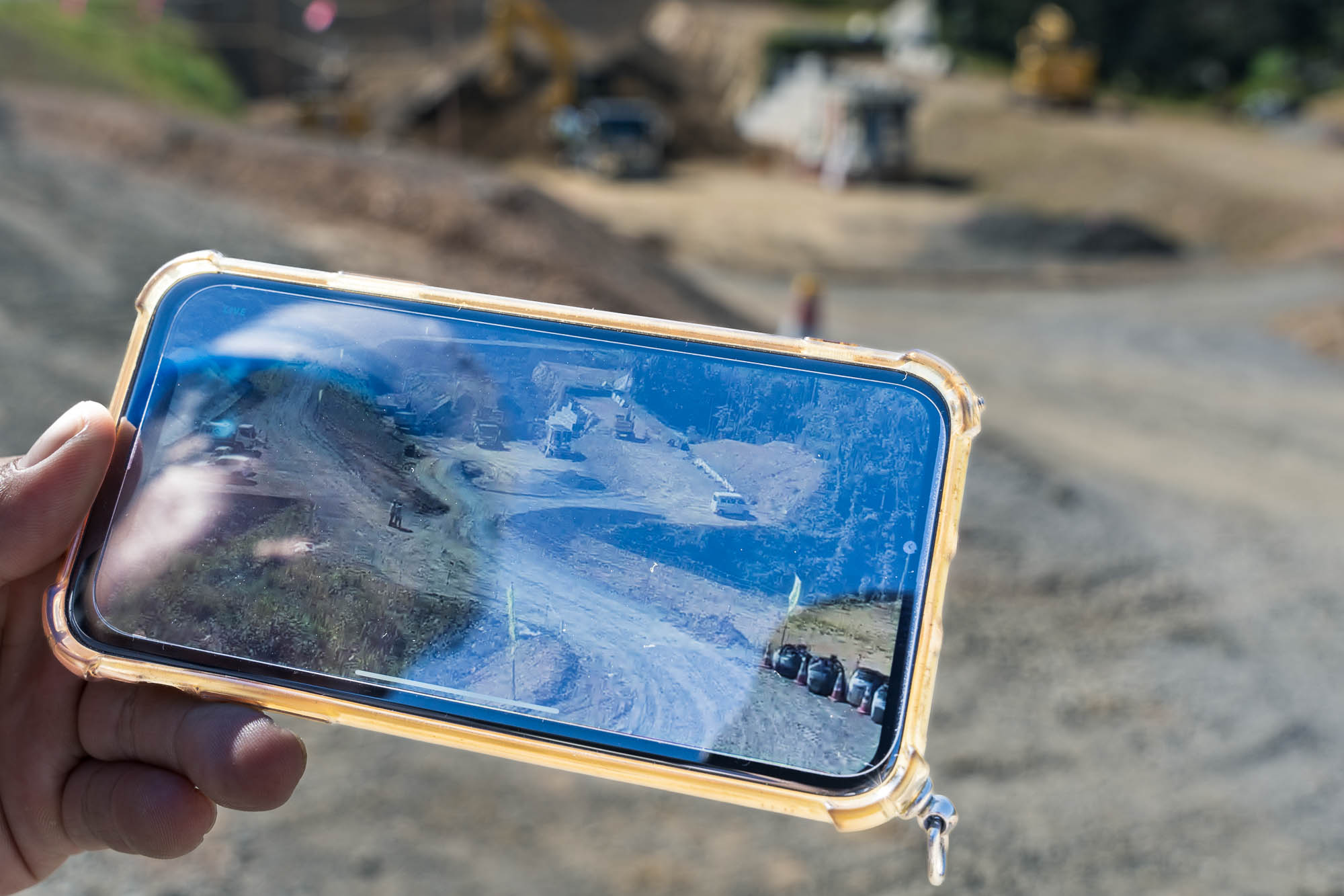 この現場の作業は主にICT施工。最初にドローンを用いた三次元測量を行い、そのデータに基づき重機を動かすそうです。あらかじめ施工するデータを重機に送信しておくと、重機についたモニターで完成形を確認しながら、効率的に作業を行えます。