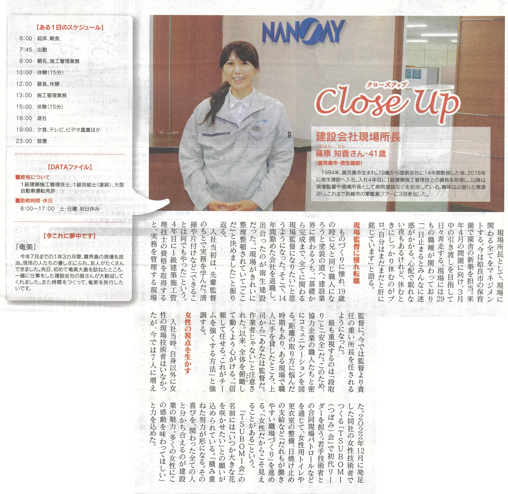 南日本新聞フェリア(2025年11月1日号)の企画「クローズアップ」に、弊社女性技術者・篠原氏の