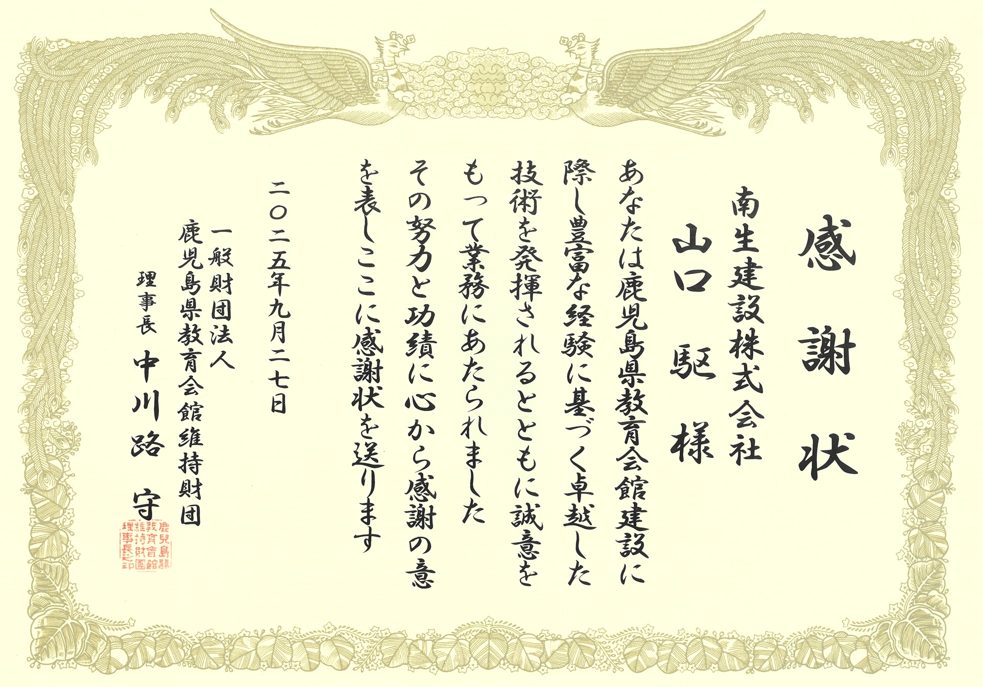 一般財団法人 鹿児島県教育会館維持財団の中川路理事長より感謝状を頂きました。